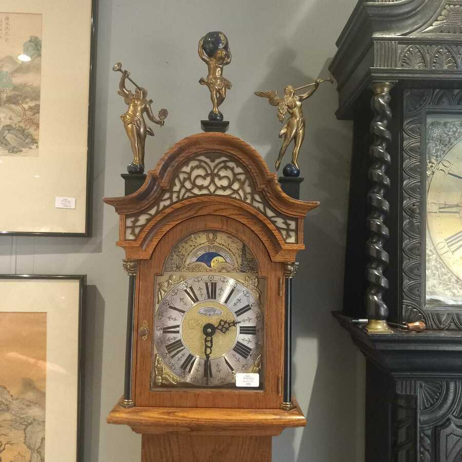 Een 20e eeuws staand horloge, Warmink, met speelwerk, maanstand, bekroond met Atlas en twee bazuinblazende engelen. Met twee gewichten.