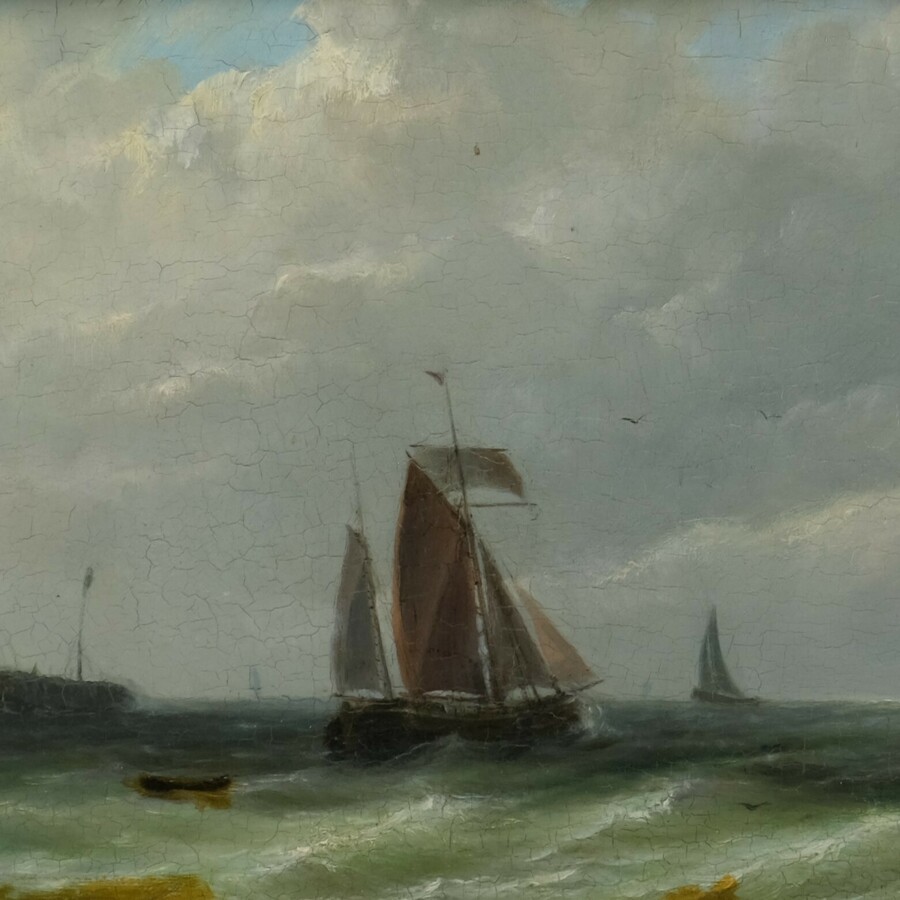 Schilderij, olieverf op paneel 28,5 x 43 cm. Zeilschip bij het havenhoofd. Rechtsonder gesigneerd Rein Miedema (Harlingen 1835 - Rotterdam 1912)