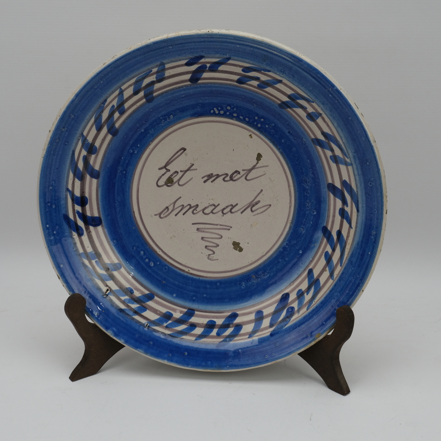 Een 19e eeuwse Lemster spreukschotel met opschrift ‘eet met smaak’. Herkomst: Collectie Wagemakers & De Haan, Edam.