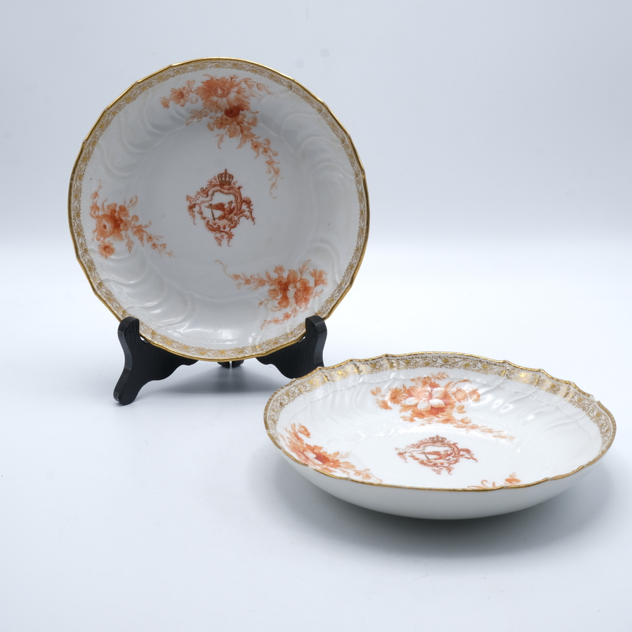Twee vroeg 20e eeuwse Duits porseleinen gecontoueerde schotels. Handbeschilderd in het oranje met diverse bloemen en een keizersadelaar. Op de achterzijde gemerkt KPM 1914 en met een monogram WR...