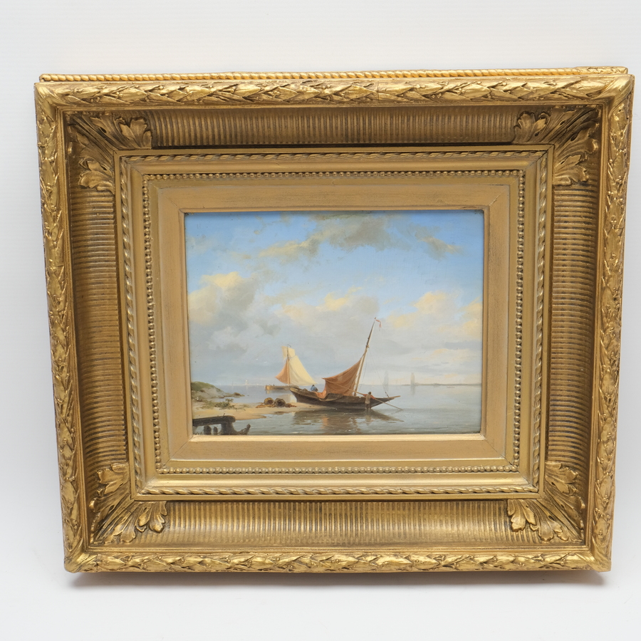 Schilderij, olieverf op paneel in goudkleurige profiellijst. Vissermannen komen aan wal. Op de steiger gemonogrammeerd 'H.K' = mogelijk Hermanus Koekkoek I (1815-1882)