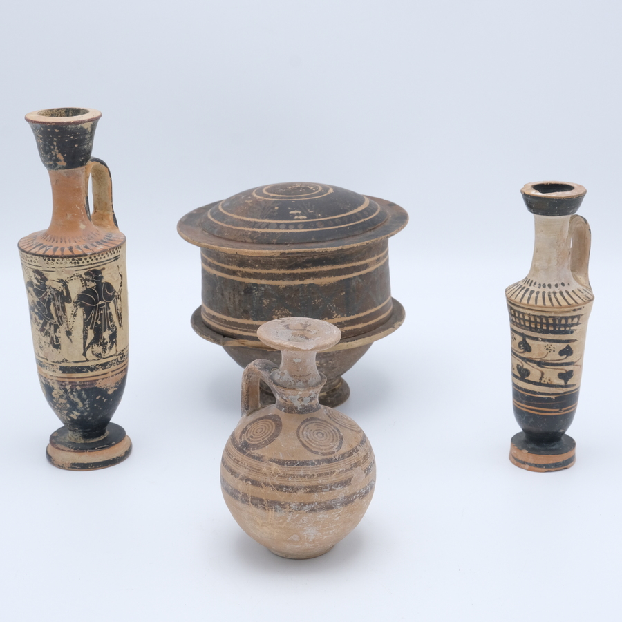Lot Grieks aardewerk: Een Cypriotisch terracotta vaasje met oor uit de ijzertijd, twee Griekse terracotta kannetjes, Lekythos, één met floraal decor en één beschilderd met decor van drie figure...
