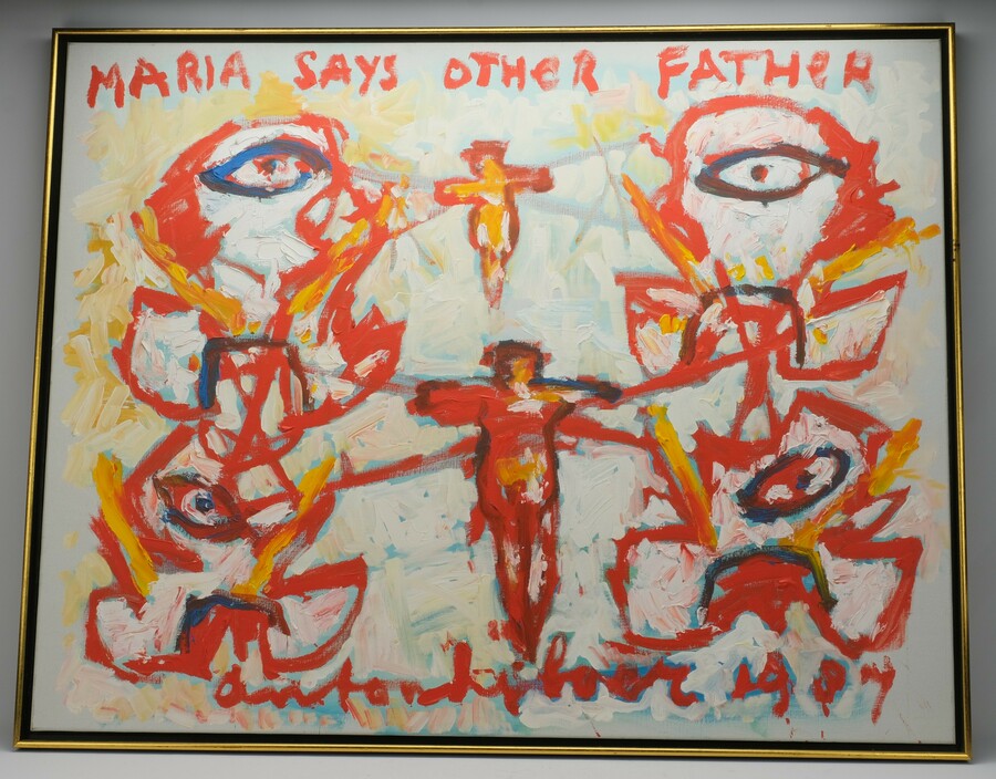 Schilderij, olieverf op doek, in baklijst. 'Maria says other father'. Gesigneerd Anton Heyboer (Sabang 1924 - Den Ilp 2005), gedateerd 1987