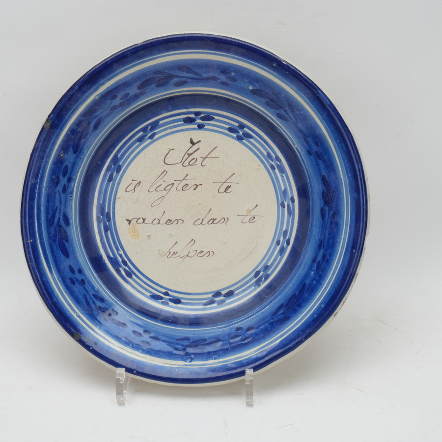 19e eeuwse Lemster spreukschotel ‘Het is lichter te raden dan te helpen’
