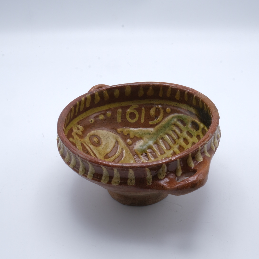 Een vroeg 17e eeuws aardewerken kom met slibversiering, gedateerd 1619. Met restauratie