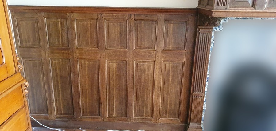 Een antieke 17e eeuwse eikenhouten lambrisering en schouw, met gestoken leeuwenmascarons