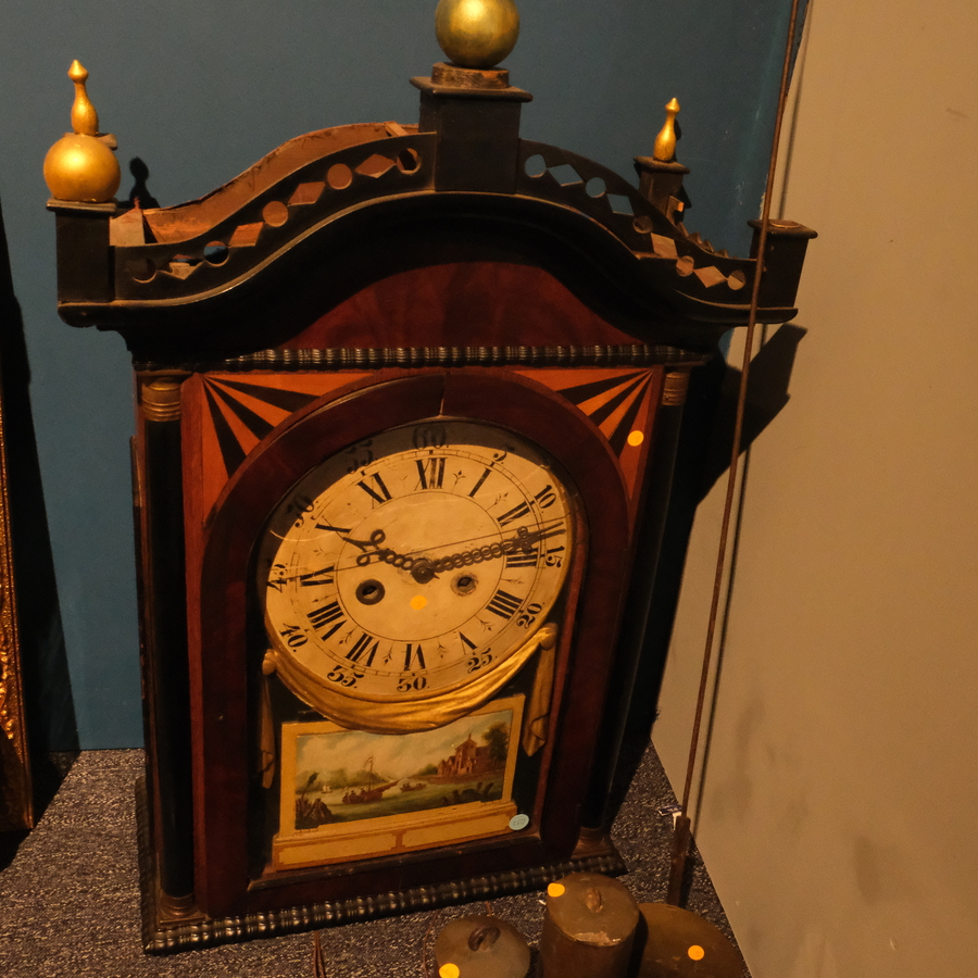 Een antiek laat 18e eeuws staand horloge, gefineerde houten kast met zwarte profielranden. Zwarte pilaren, wijzerplaat met beschildering van een schip in landschap en een gedrapeerd kleed.