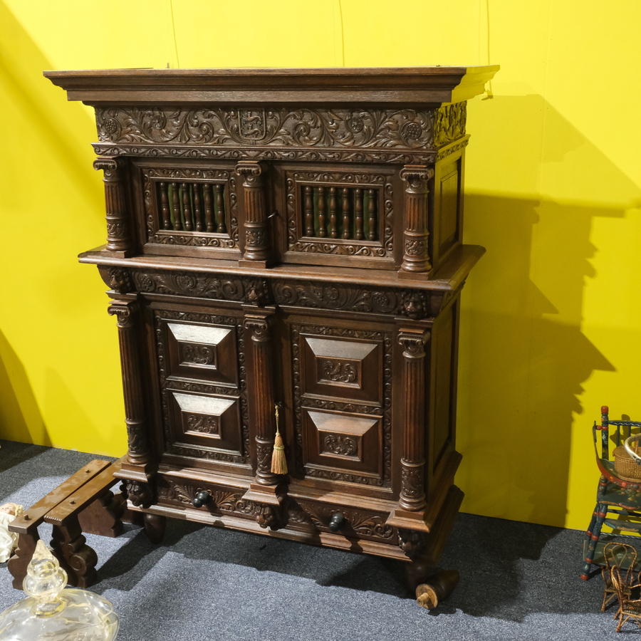 Een eiken neorenaissance vierdeurs broodkast. Met volle pilaren en steekwerk op de fries en deuren. Met florale decors, een wapenschild en leeuwenkoppen. Voorzien van twee laden onderin. Op twee...