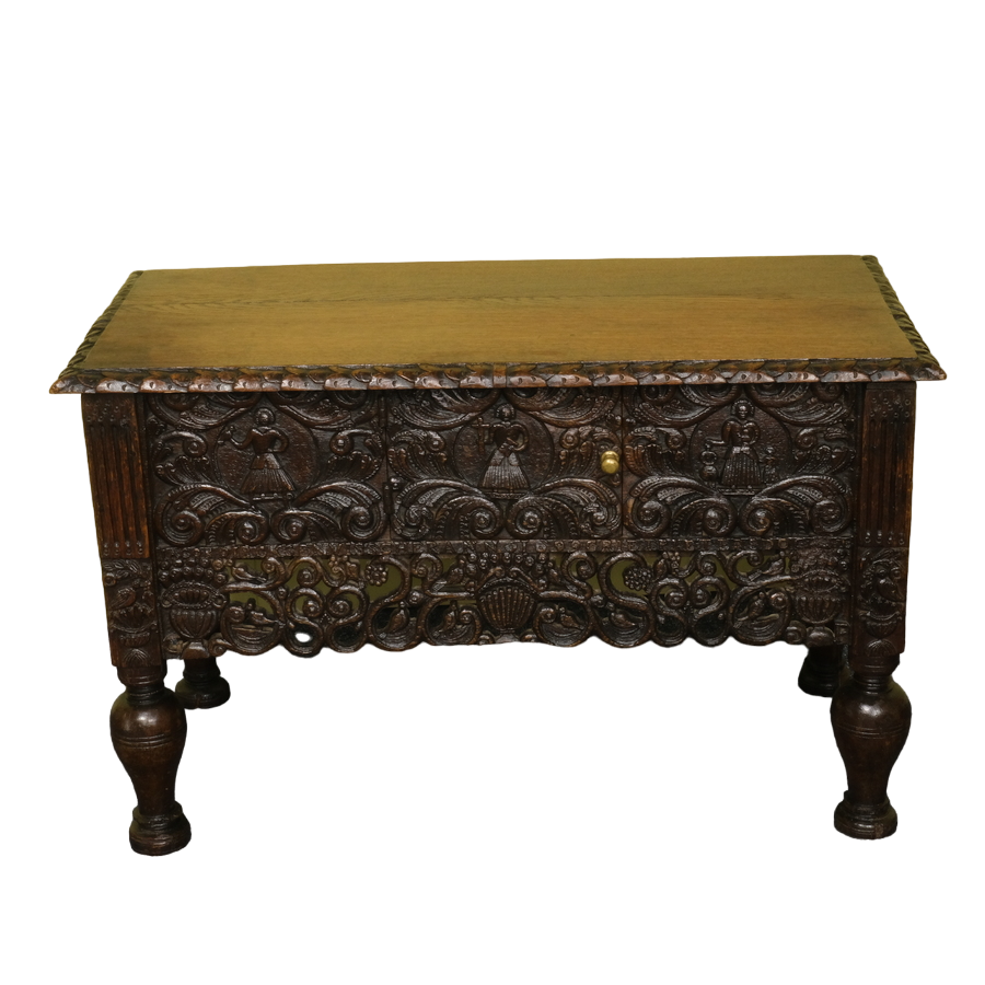 Een antieke 17e eeuwse kistbank met gestoken afbeelding van Geloof, Hoop en Liefde. Met tekst 'Jacob Dircksen Visscher - Anno 1699 - Griet Pietersdochter'