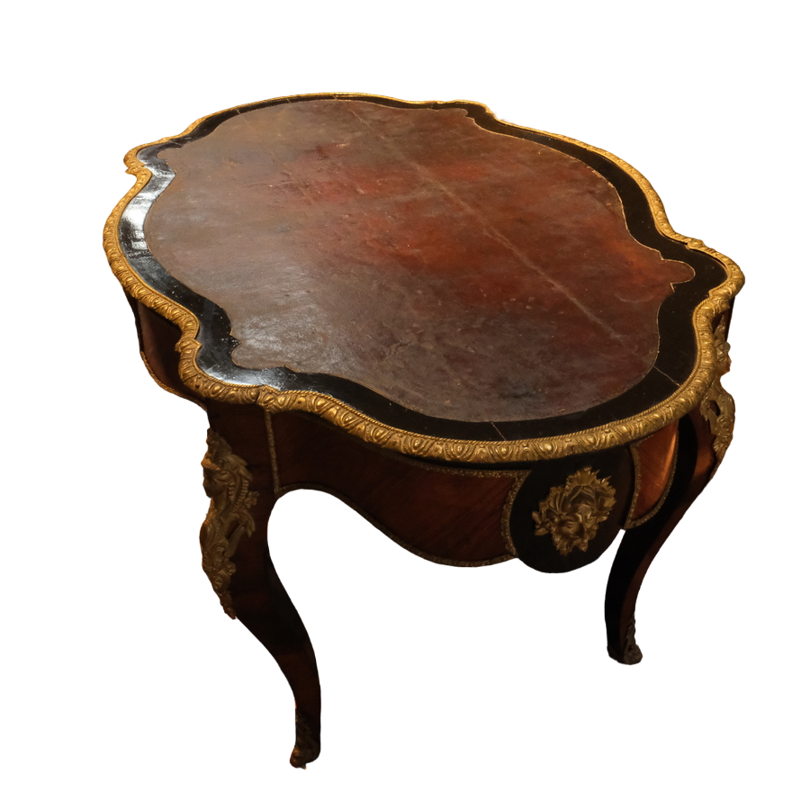 Een antiek 19e eeuws Frans Napoleon III tafel, zgn. 'violon', gefineerd & gedeeltelijk zwartgelakt hout, met lade, bronzen ornamentiek en bruin lederen blad.