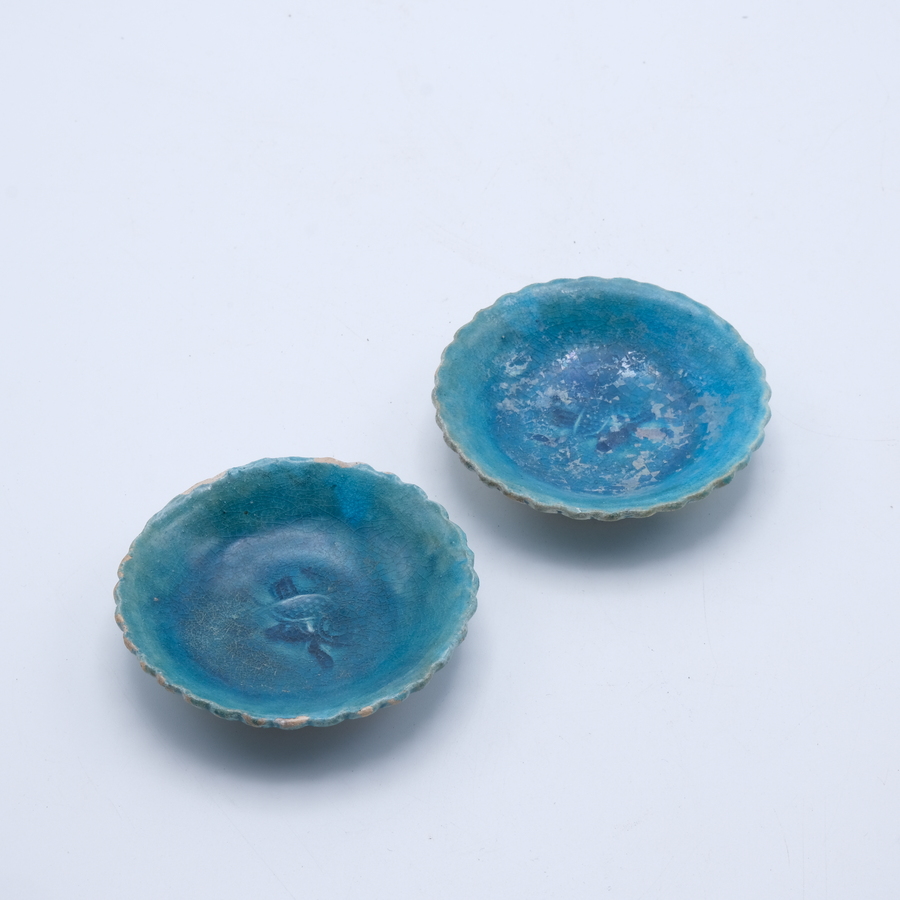 Twee kleine turquoise schoteltjes met decor van vissen, Kangxi periode