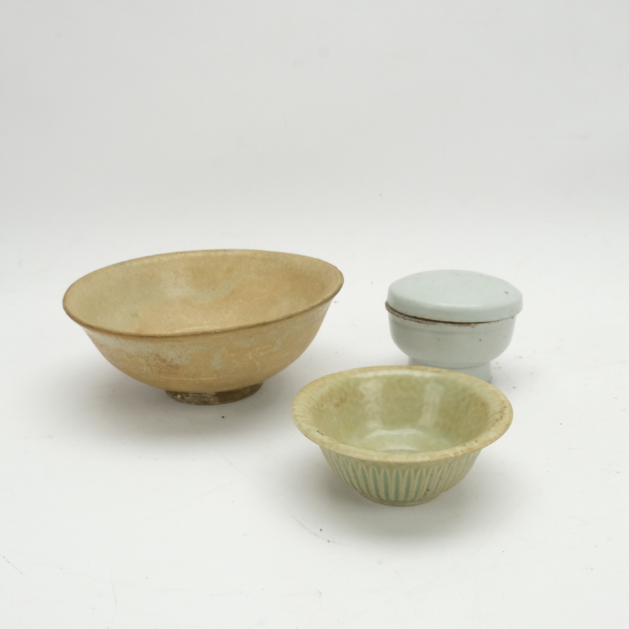 Twee Chinees steengoed kommen en een zalfpotje met deksel in celadon glazuren. Mogelijk uit de Song periode.
