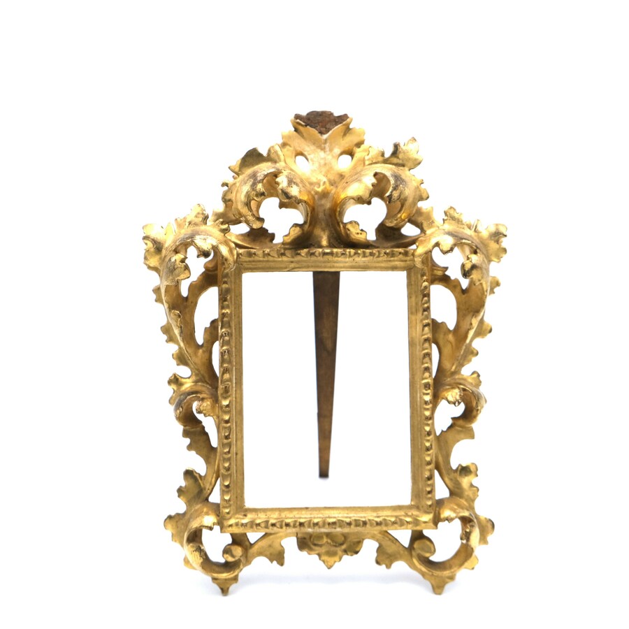 Een antieke Italiaanse roccoco stijl houten gestoken en vergulde lijst, buitenmaat 29 x 22 cm, binnenmaat 14 x 10 cm. Voor spiegel of portret. 19e eeuws of ouder.