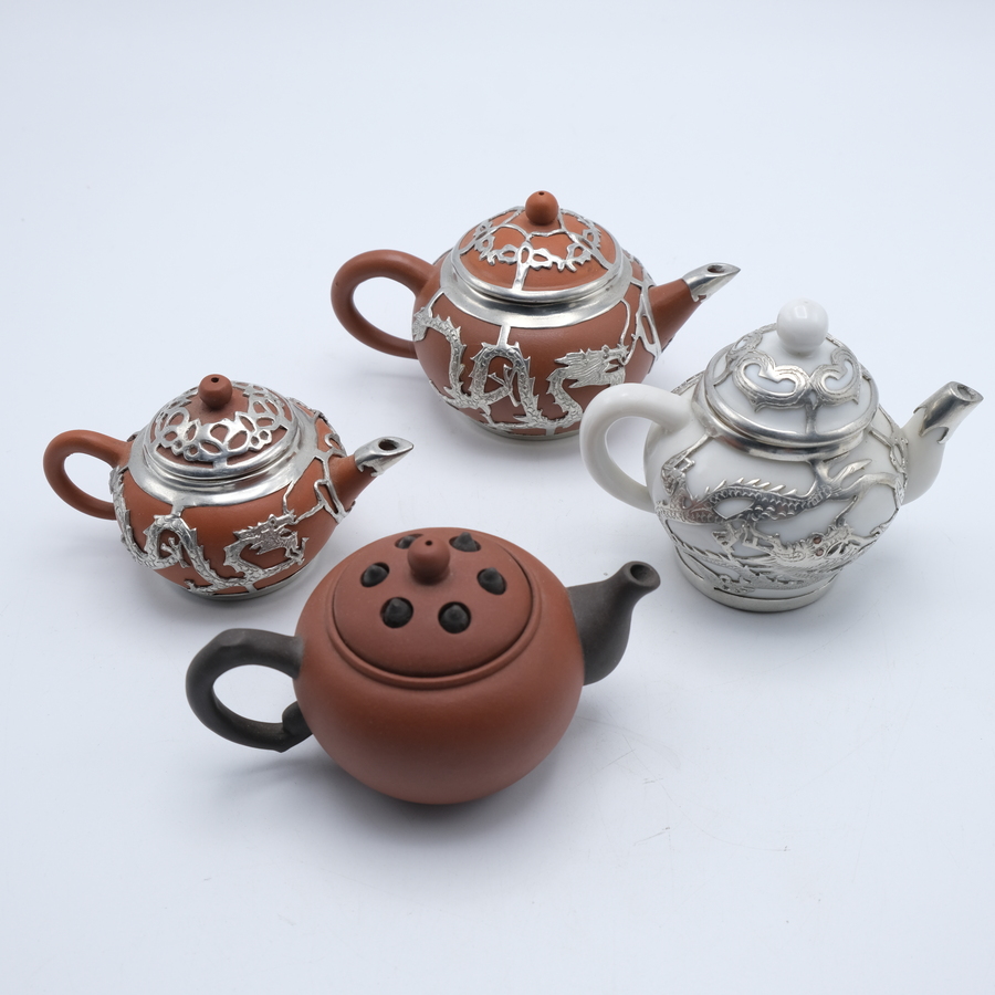 Drie Chinees bruin steengoed Yixing en één blanc de chine trekpotjes. Waarvan er drie met wit metaal zijn omkleed. Met een decor van dranken. De andere met beweegbare pionetjes in de deksel. 20e...
