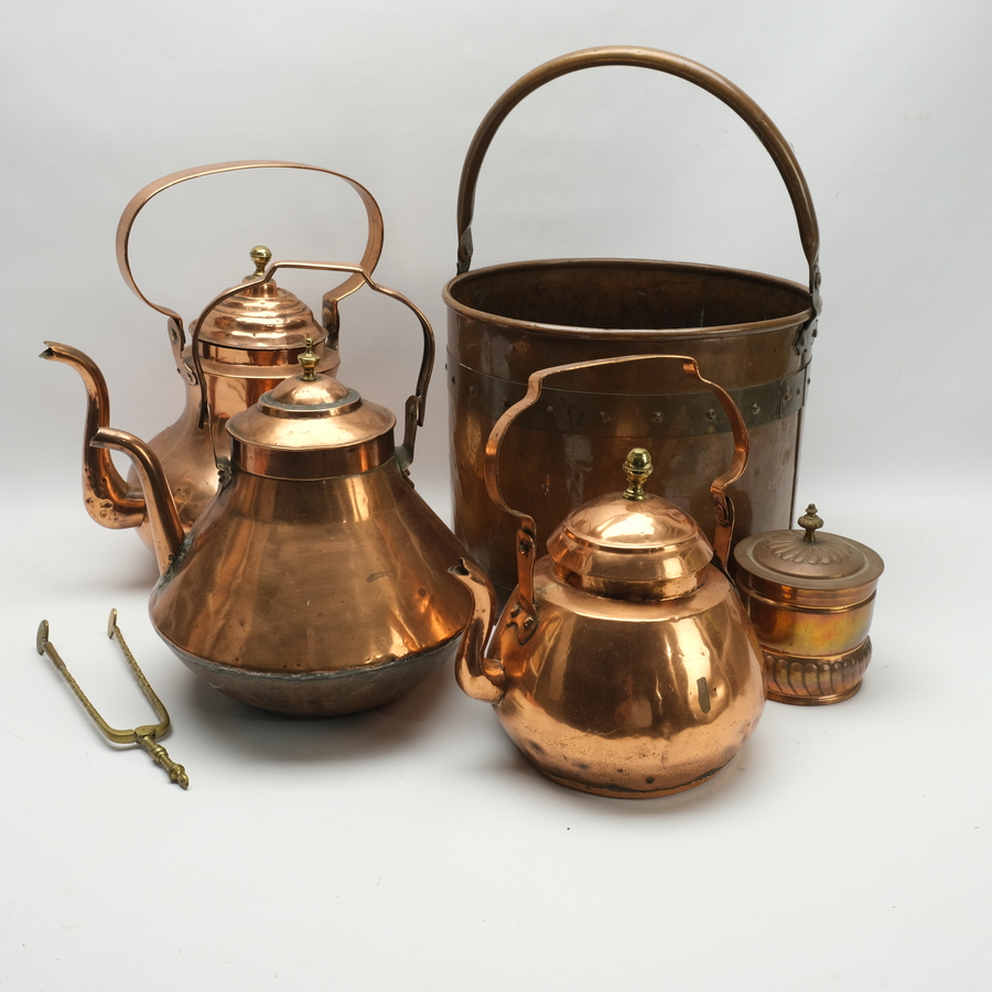 Lot koperen voorwerpen, bestaande uit een aker, Drie ketels, tabakspot en een tondeldoos met tang.