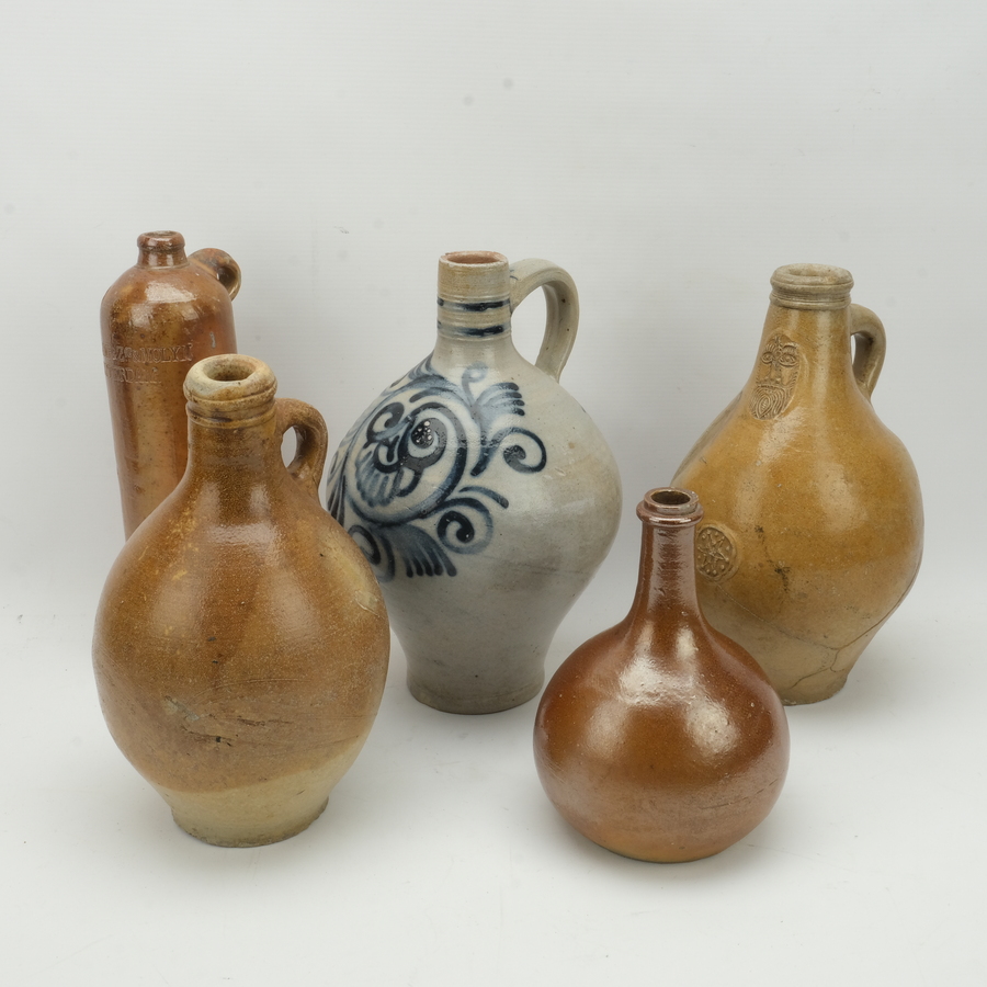 Lot van vijf steengoed kruiken, waaronder een 18e eeuwse Nederlandse baardmankruik, gerestaureerd