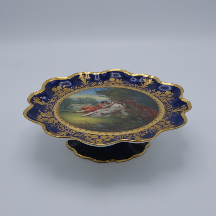 Een antieke Frans faiance oorkan, naar een Delfts voorbeeld en een dito schildvormig schaaltje gedecoreerd met putto en ramskop.