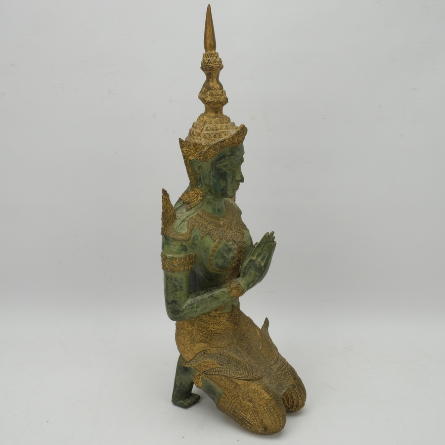 Een 20e eeuws bronzen gepatineerd sculptuur van een tempelwachter, 44 cm hoog