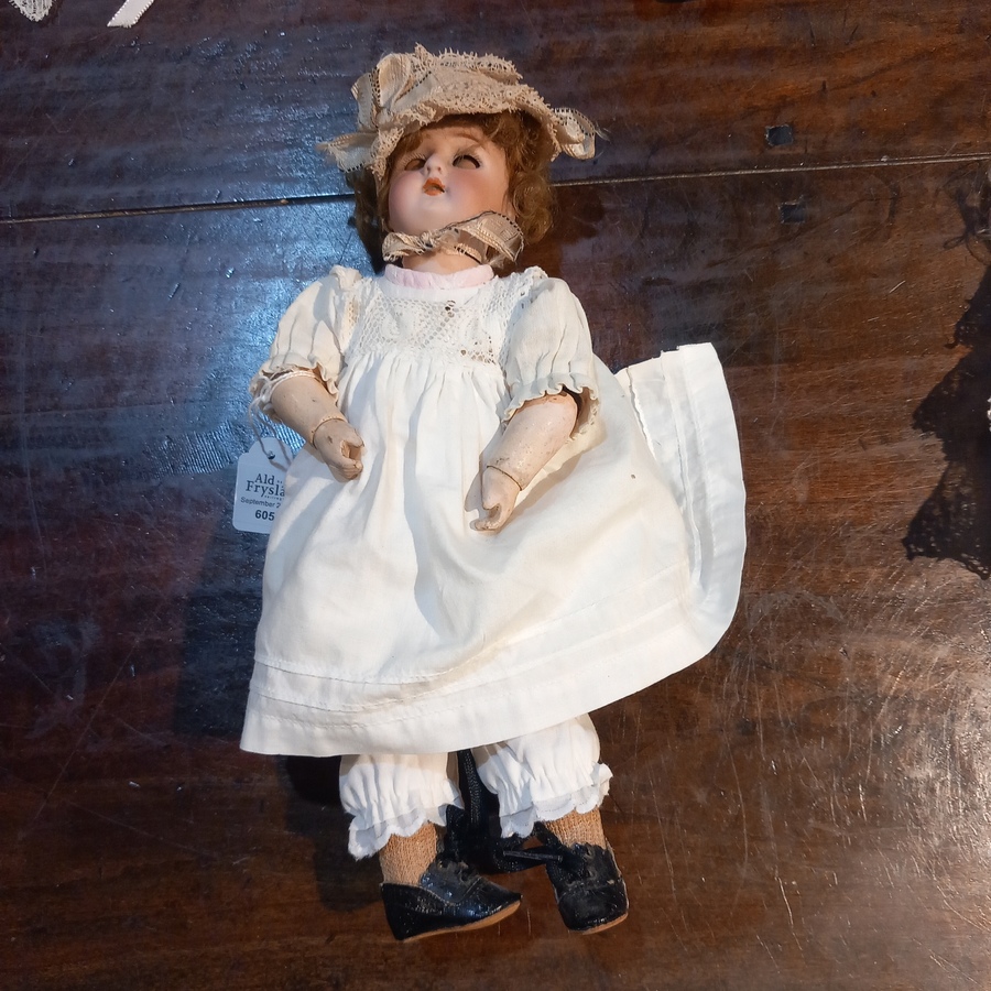 Een antiek popje met papiermaché armen en benen. Met een porseleienen hoofdje en bruine pruik. Gemerkt H. W. Halbig. Gekleed.