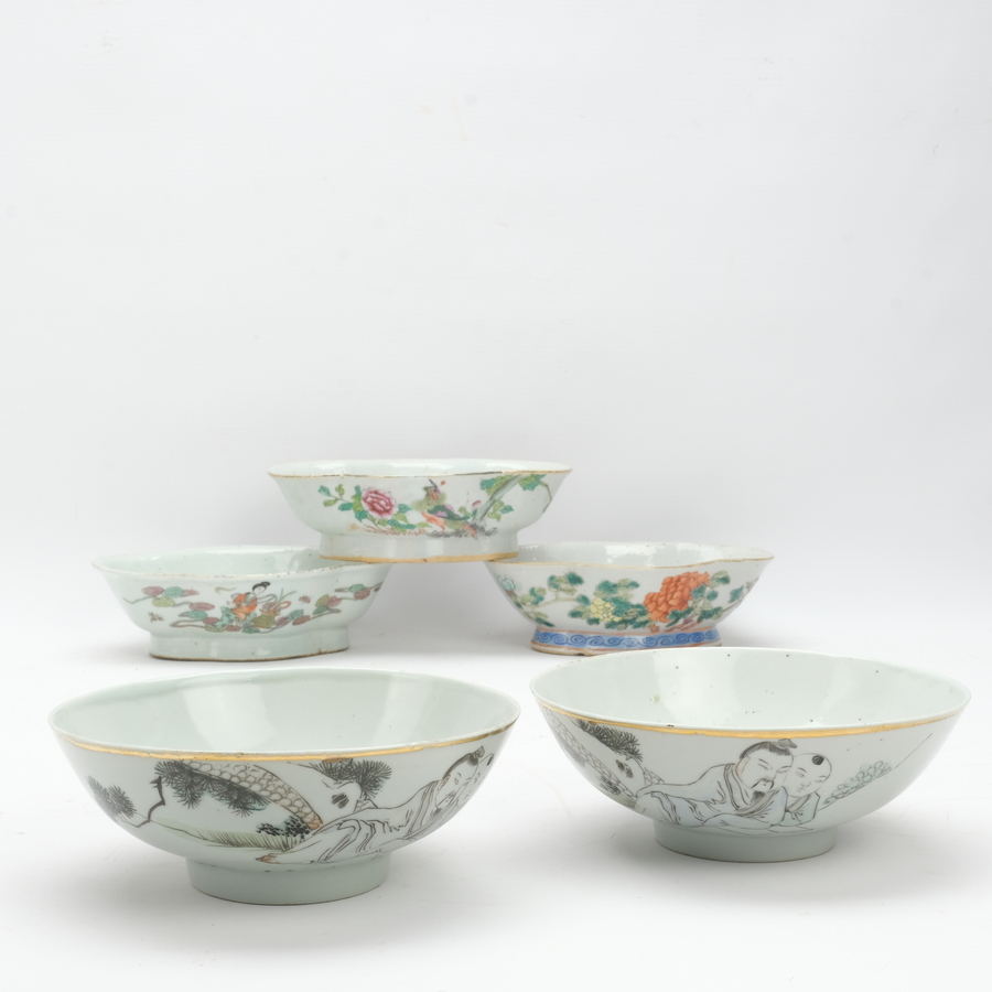 Lot van drie antieke 19e eeuwse Chinees porseleinen ovale schaaltjes met diverse decors: bloemen, vogels op bloemen en figuur in de wolken. Twee versierd met kalligrafie. Met daarbij twee 20e ee...