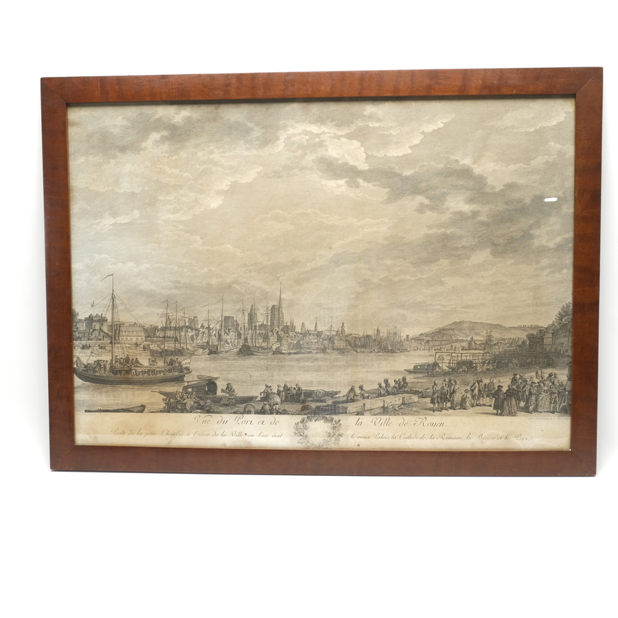Een grote antieke 18e eeuwse kopergravure ‘Vue du Port et de la Ville de Rouen’, ca. 1760.