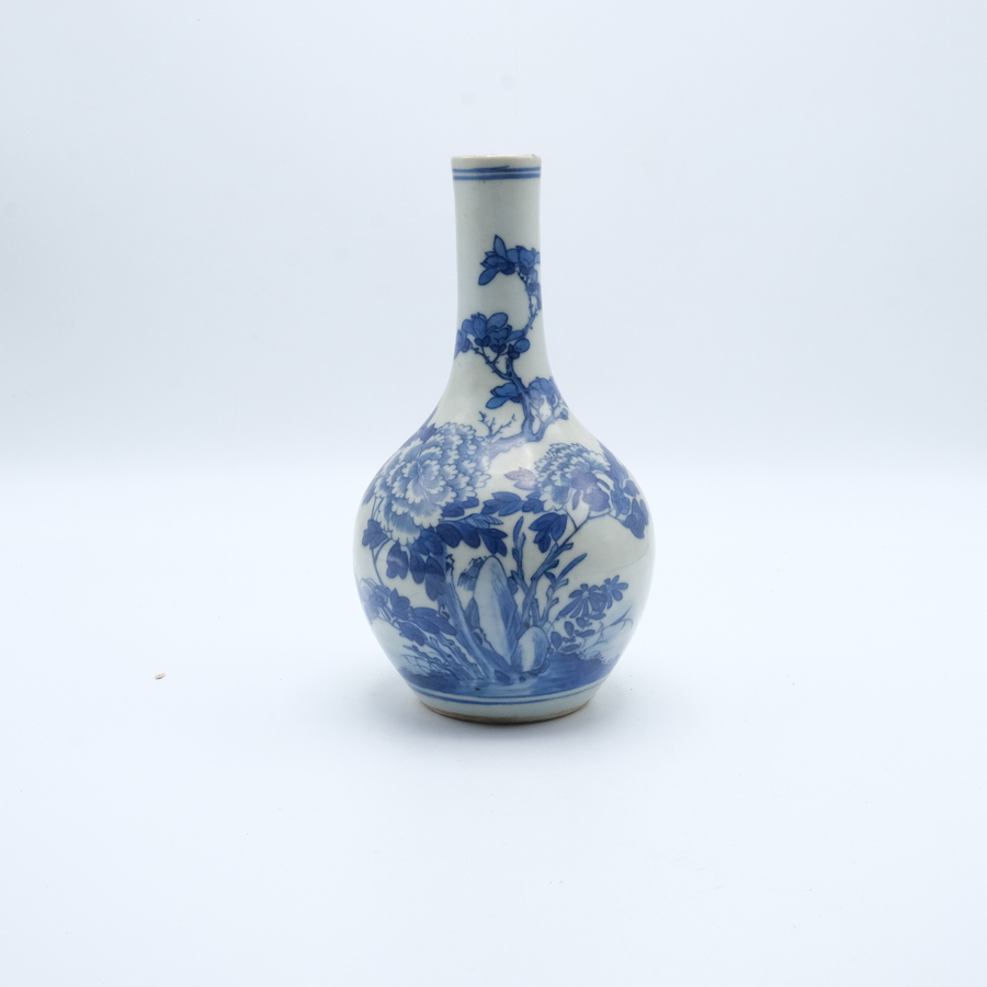 Een Chinees 19e eeuws porseleinen pijpvaas. Blauw/wit met een decor van pioenrozen bij de rotsen.