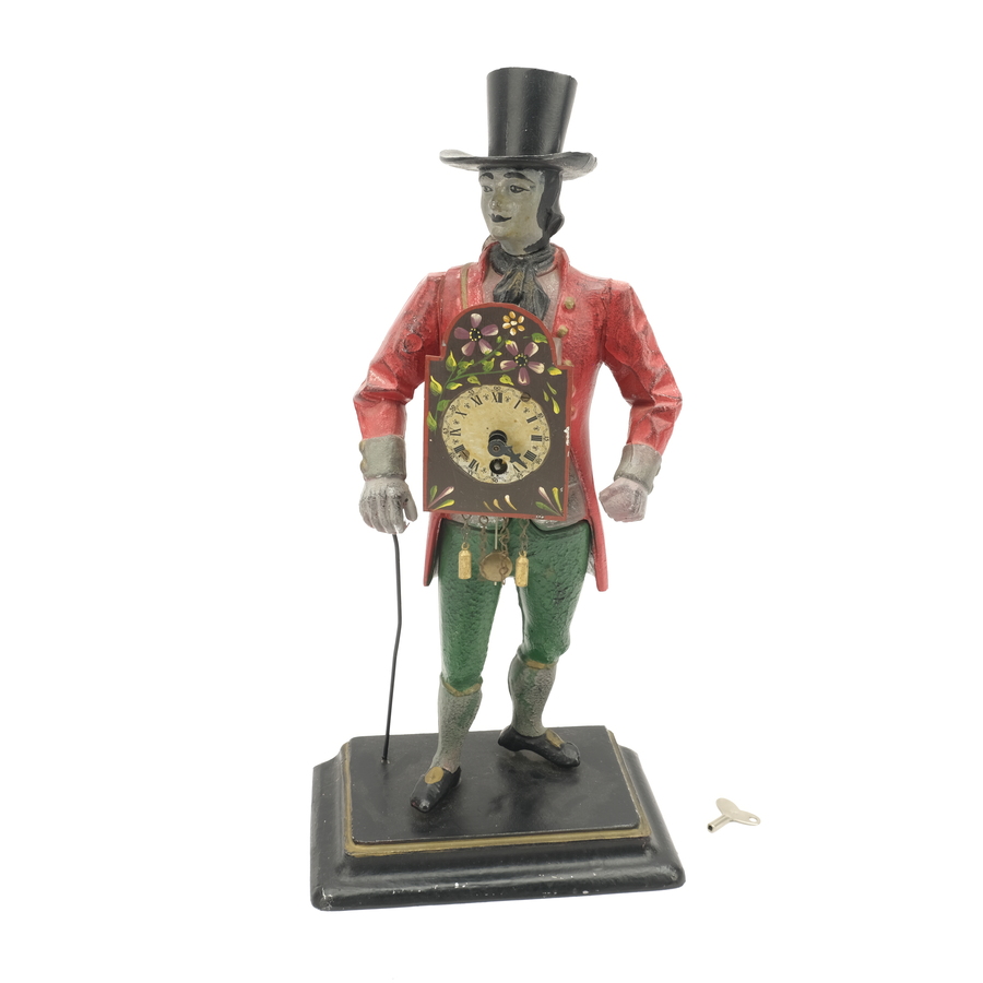 Een 20e eeuwse metalen tafelklok, voorstelling van een man met hoed met een klok op zijn rug en buik.
