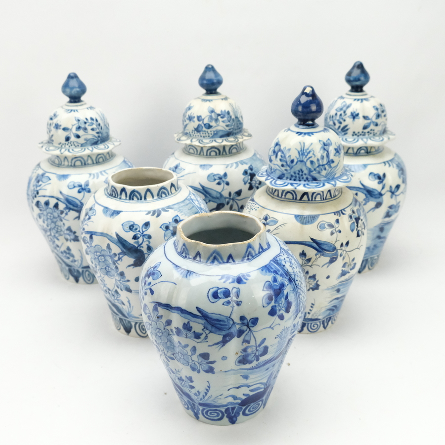 Zes Fries aardewerken dekselvazen, waarvan vier met deksels. Blauw/wit met Chinoiserie decor van vogels en bloemen. 20e eeuws.Gemerkt Tichelaar, Makkum