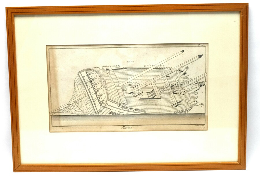 Twee 18e eeuwse Franse maritime gravures op papier. Scheepsvoorstelling van een schips interieur en droogdok en schip slagzij. Gesigneerd in de druk Bernard Direxit ca. 1788. Gelijst