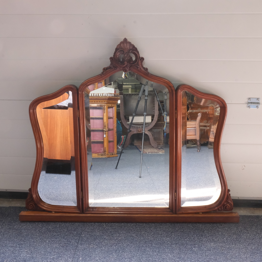 Een antieke spiegel, facetgeslepen, met twee spiegels aan de zijkant, in houten lijst. Onderdeel van een meubel geweest, ca. 1900
