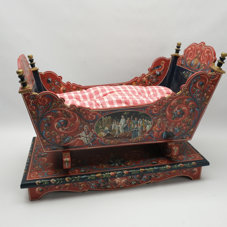 Een model van een houten en Hindelooper beschilderde wieg. Met een Bijbelse voorstellingen en rondom florale decors. Op een origineel plateau. Toegeschreven vervaardigd en beschilderd door Meine...