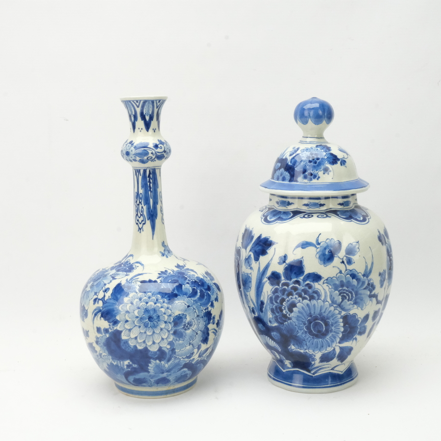 Twee diverse aardewerken vazen in het Delfs blauw. Een dekselvaas en een balustervaas. Beide met florale decors. Gemerkt de Porceleyne fles.