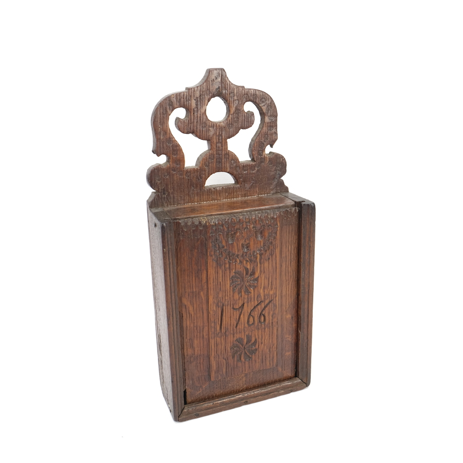 Een 18e eeuwse eikenhouten schooltas, versierd met steekwerk. Gedateerd 1766.