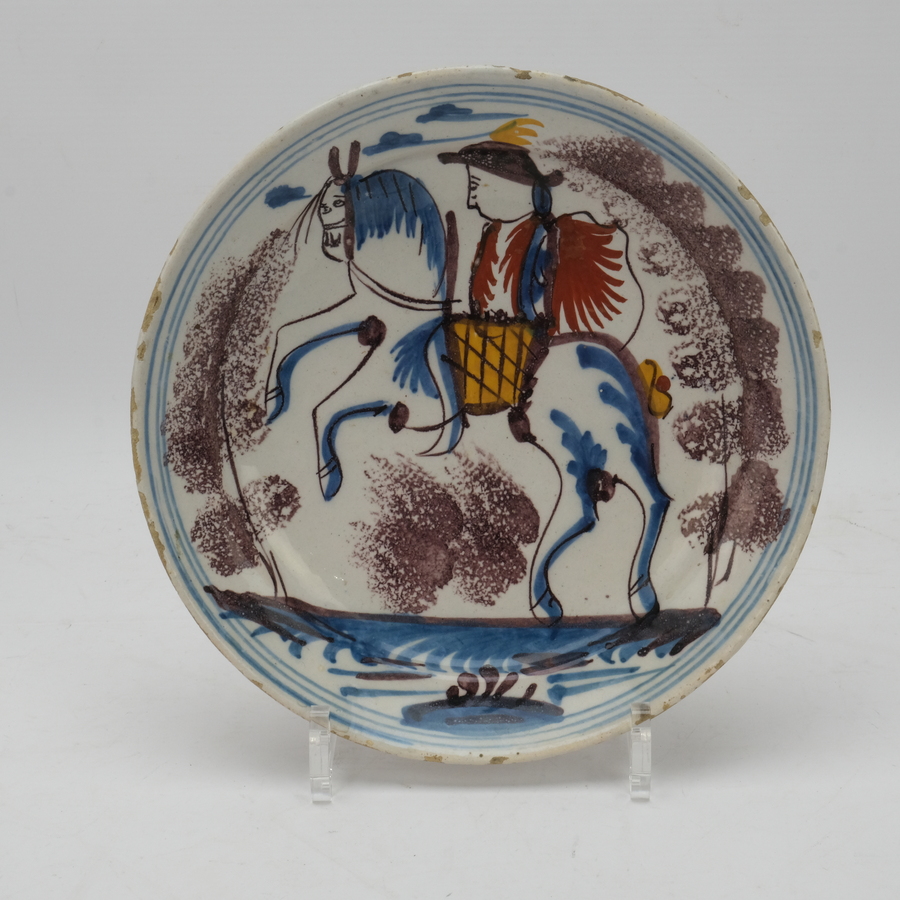 Een antiek 18e eeuws Delfts aardewerken bord met polychroom decor van ruiter te paard