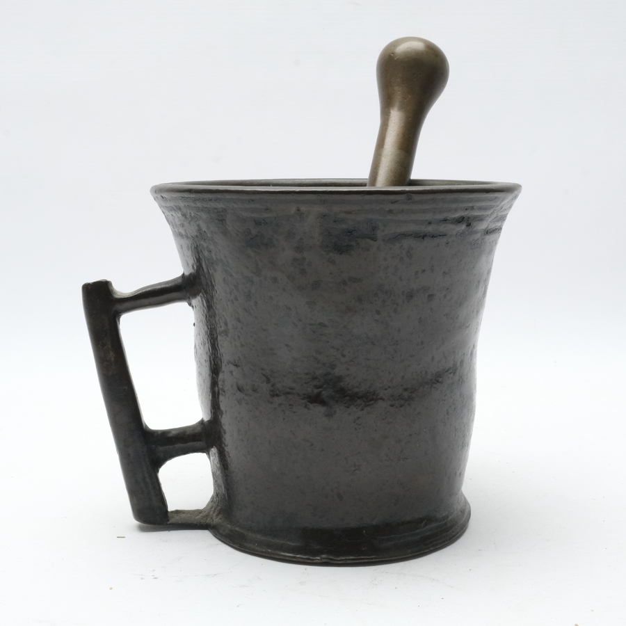 Een antieke bronzen vijzel met stamper, in Gotische stijl. Stamper niet bijpassend