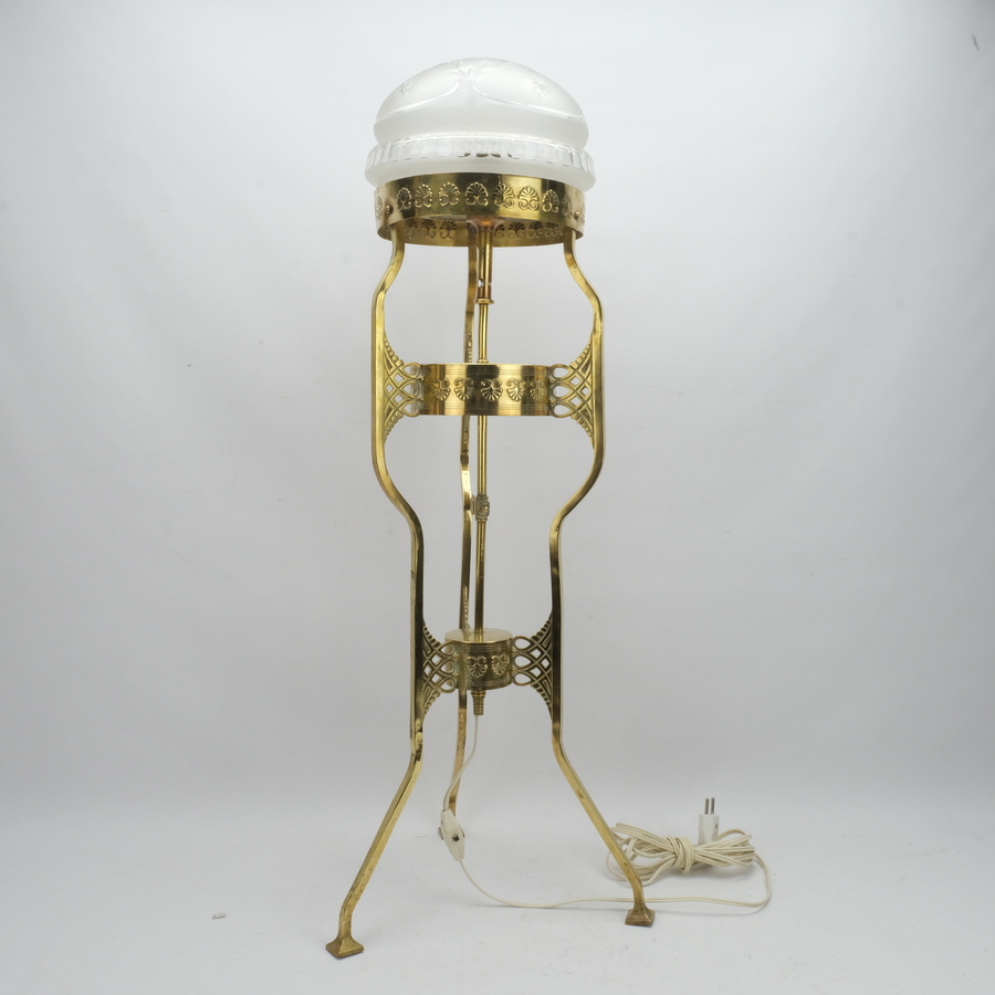 Een vroeg 20e eeuwse koperen lamp, omgebouwde gaslamp, met kristallen gesatineerde en gegraveerde kap.