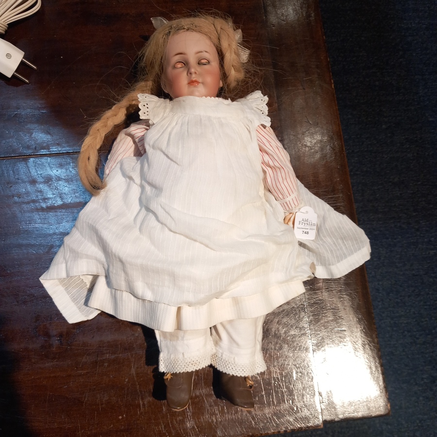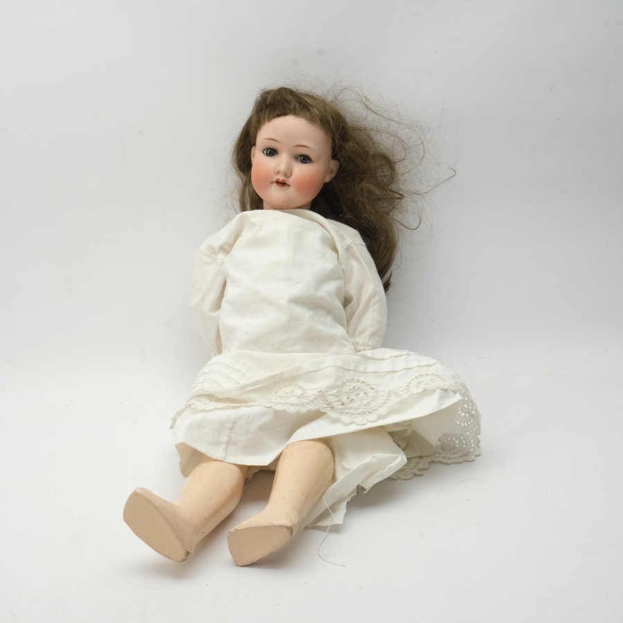 Een antieke karakterpop met een papiermaché lijf en beweegbare armen en benen. Voorzien van een porseleinen hoofd en blonde pruik. Gemerkt Simon & Halbig, Kammer & Reinhardt nr 117. (Mei...