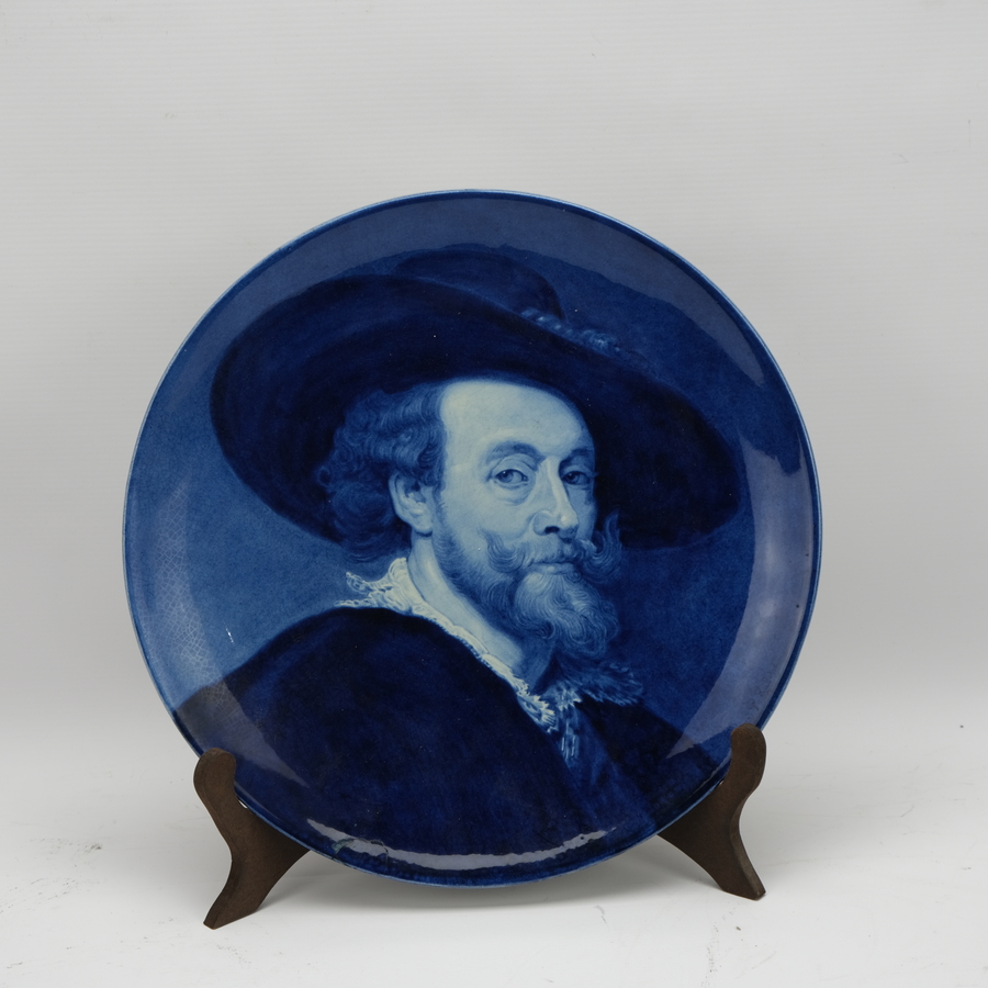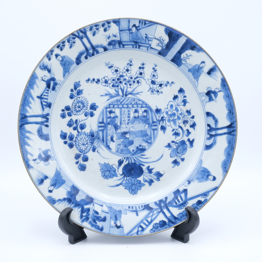 Een 18e eeuws Chinees porseleinen bord, Kangxi periode (1661-1722) met voorstelling van figuren in een interieur in medaillon en op de rand