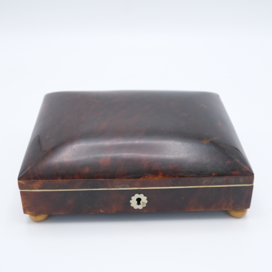 Een antieke 19e eeuwse schildpad theegarnituurdoos, geplaatst op bolpootjes. Bestemd voor zilveren theelepeltjes, theeduimpje, en suikerschepje (niet aanwezig). Binnenin met spiegel.