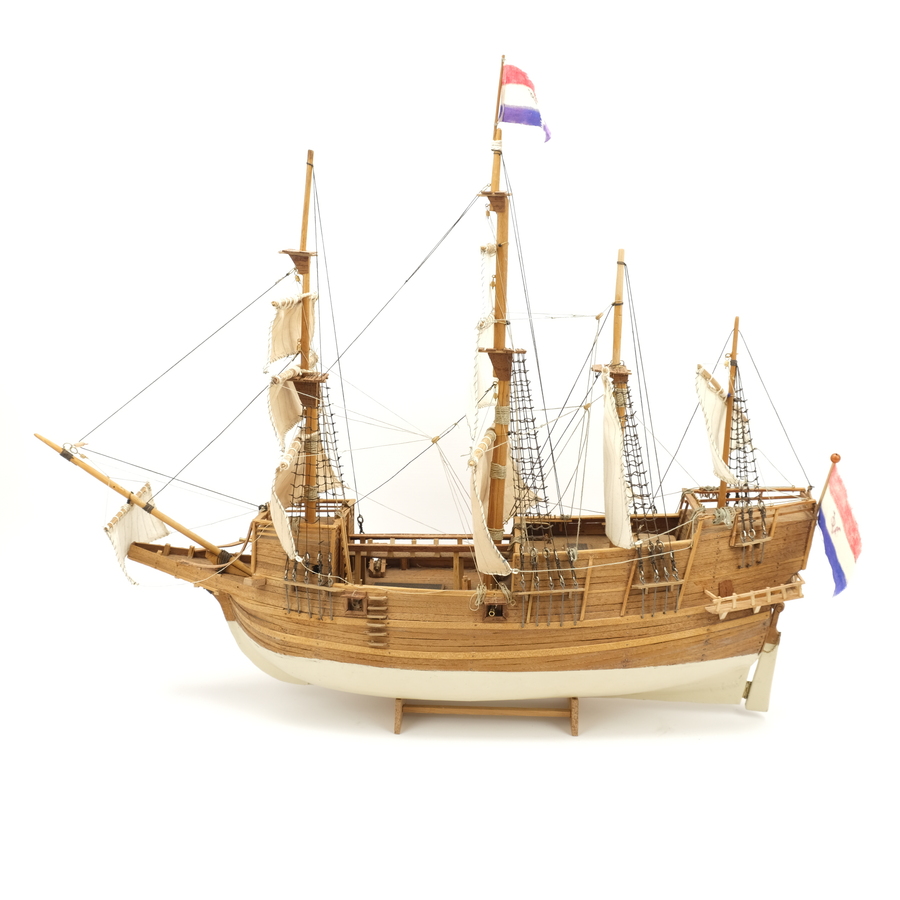 Een handgebouwd modelschip, voorstelling van een VOC galjoen uit de 16e/17e eeuw