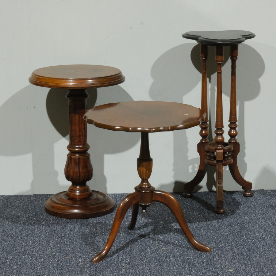 Lot van drie houten tafeltjes, twee op driepoots voet, één op ronde poot