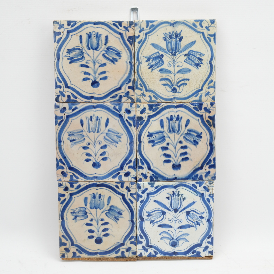 Zes antieke 17e eeuwse blauw-wit beschilderde tegels, decor van drie tulpen in medaillon