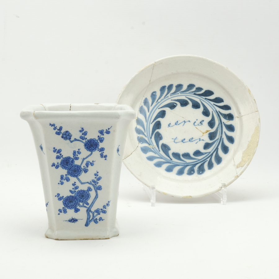Een 18e eeuwse Delfts aardewerken jardiniere met blauw-wit decoractie van bloemen op tak, gemerkt D16. En een 18e eeuws spreukbordje met spreuk ‘eer is teer’