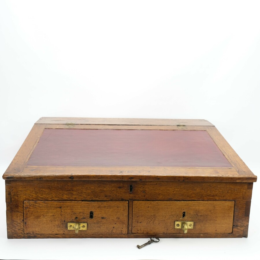 Een 19e eeuwse grote eikenhouten schrijfkist met koperbeslag. Blad ingelegd met leder, twee laden aan de voorkant en twee aan de zijkant.