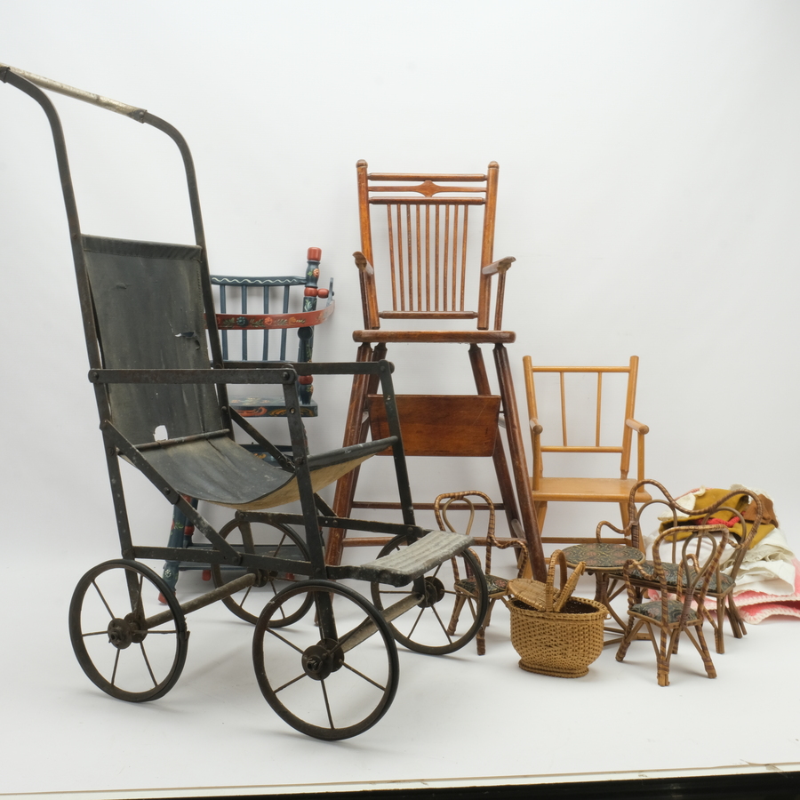 Een lot met diverse poppenmeubelen, bestaande uit stoelen, een vierdelig ameubelement, een metalen poppenwagen en een lotje met poppenkleding met rieten mandje.