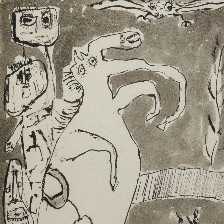 Tekening, oost-indische inkt. Abstracte voorstelling, steigerend paard. Rechtsonder gesigneerd Lucebert (Amsterdam 1924 - Alkmaar 1994), gedateerd 1952.