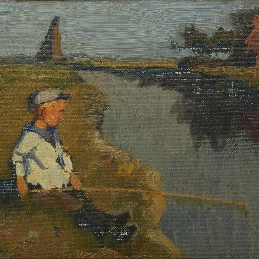 Schilderij, olieverf op paneel. Vissend jongetje aan de waterkant. Linksonder gemonogrammeerd Ids Wiersma (Brantgum 1878 – Dokkum 1965). Het betreft Freark Wiersma uit Brantgum, een neefje van I...