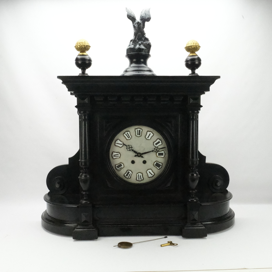 Een grote 19e eeuwse zwarte houten tafelklok, marmeren wijzerplaat met emaille wijzers, bekroond met adelaar