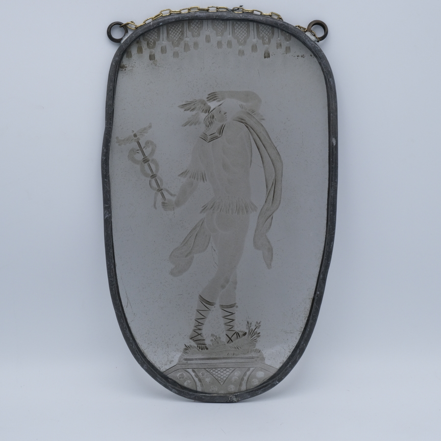 Een 18e eeuws glazen raam met radgravure voorstelling van Mercurius. Ex-collectie antiquair Wegenaar, Den Haag.