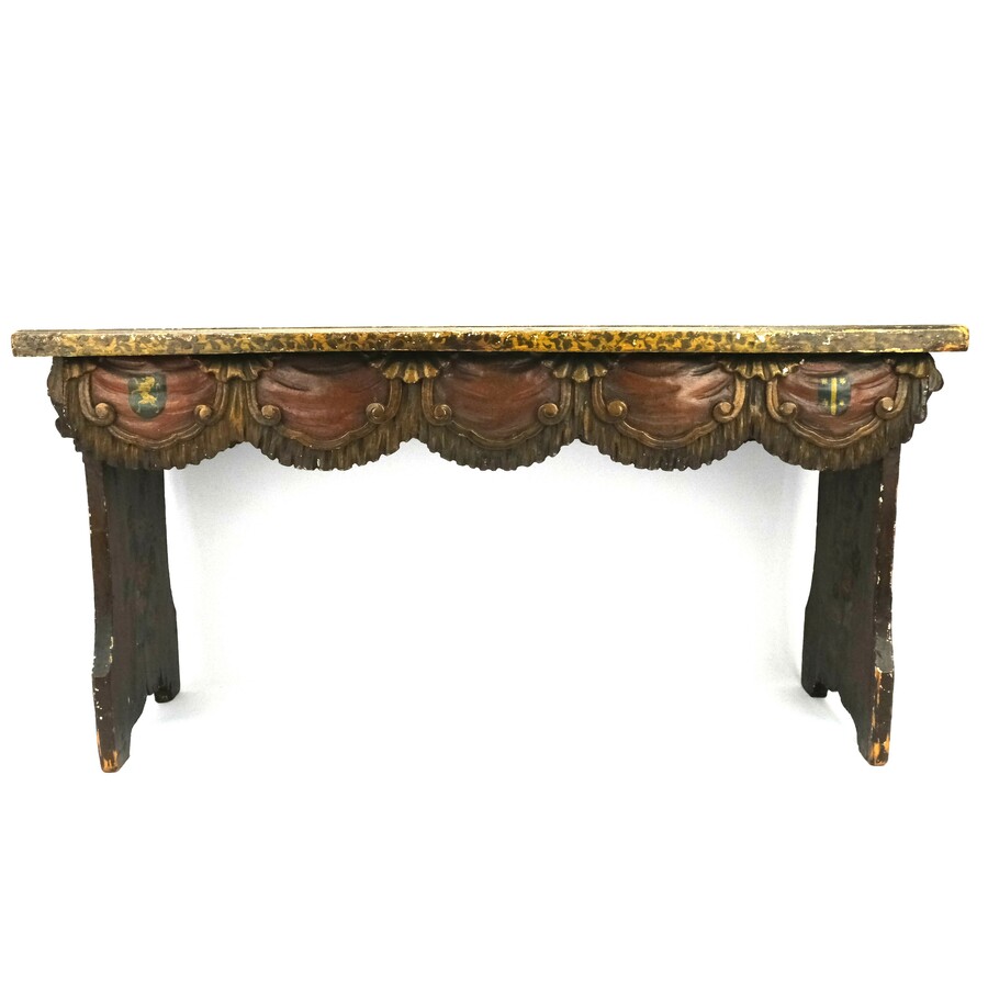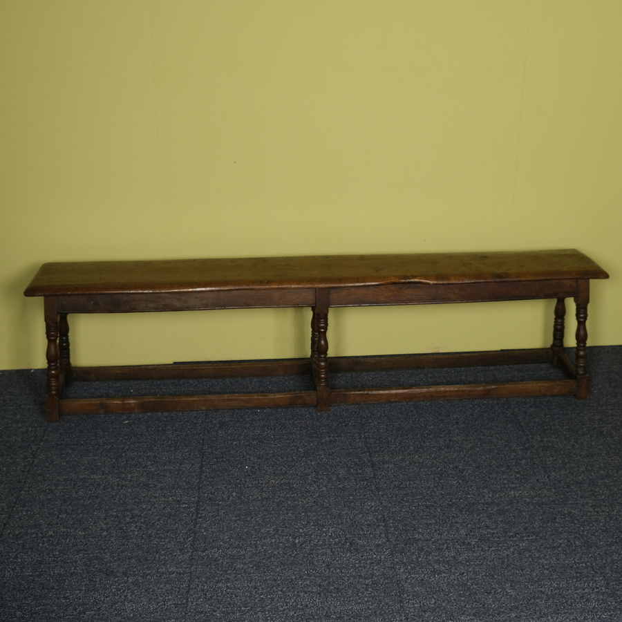Een lang 18e eeuws eikenhouten bankje, vermoedelijk Engels, met gedraaide houten poten.